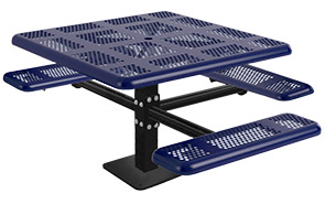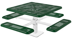 These perforated metal outdoor tables offer the versatility of permanent placement to deter theft or the portable ability to accommodate constantly changing needs. A strong pedestal frame supports the table top and seats. All tables are 46" square and come standard with a 2-3/8" umbrella hole. Table top and seats are coated with a lightly textured matte Polyethylene finish. Frames are powder-coated.
